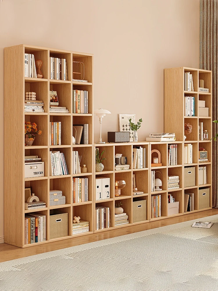 自由に組み合わせ可能な無垢材収納キャビネット - リビングにぴったりの高低書棚一体型ウォールブックシェルフ。おしゃれで機能的な書斎の展示スペースを実現!